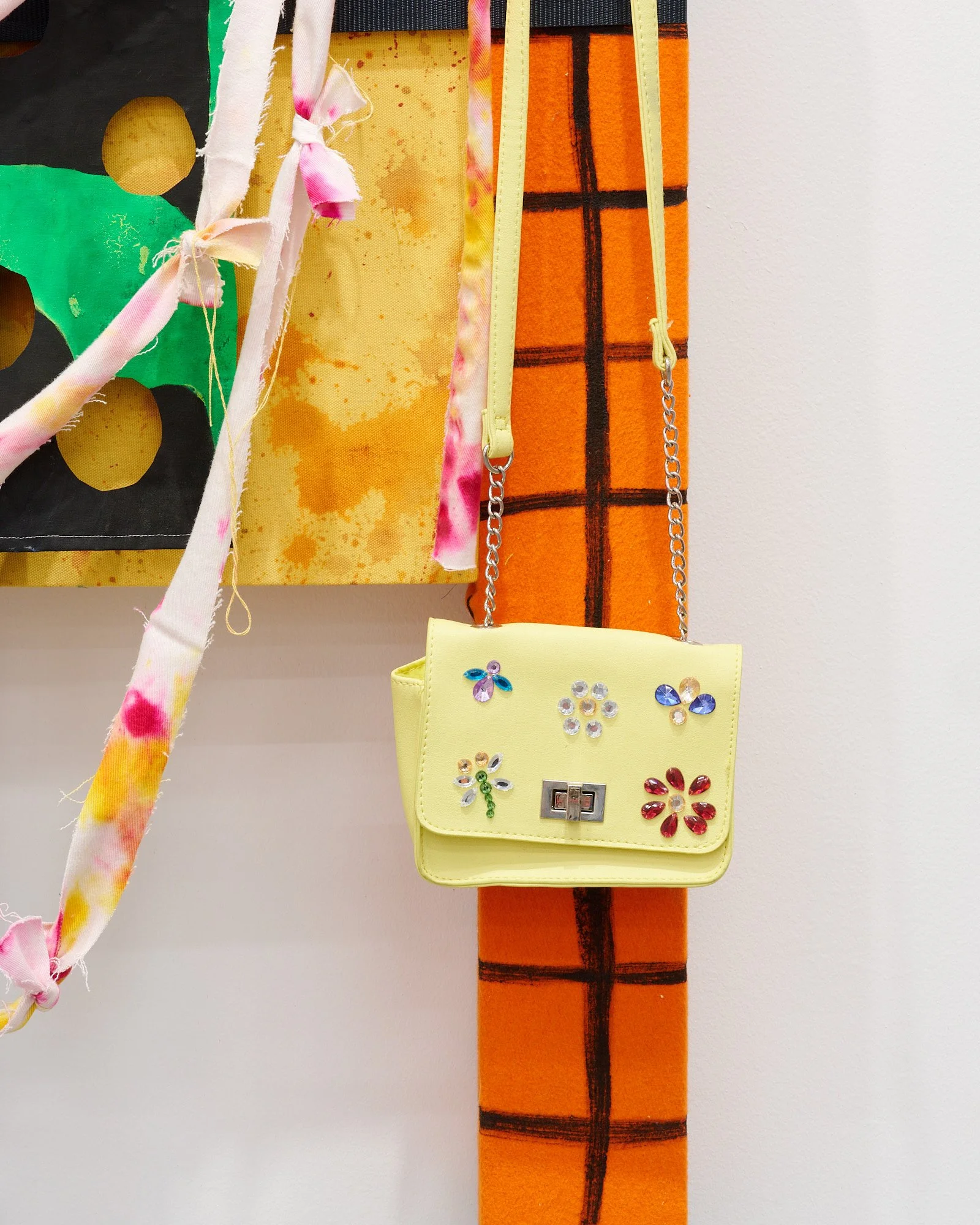 2024, A painting I made a few years ago about how we all stop dreaming too soon, a metal butterfly with plastic gems stuck to it, parts of the pants that Cassie dyed for me, shipping crate, fabric, dye, acrylic ink, wood, spray paint, tail of the matching dinosaur onesies that Claire and I bought one halloween, a small yellow purse, tender springs, hooks, candle, ratchet strap, staples, lucky necklace, thread, 108 x 36 x 6 inches